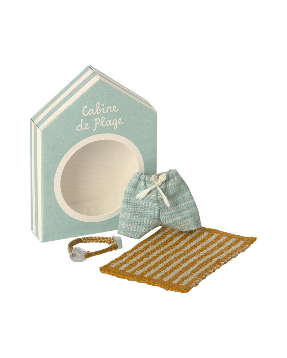Vacation time. This set include all essential accessories for a fun day at the beach: trunks, goggles and a towel. It all fits the mice in size big brother/sister perfectly.
