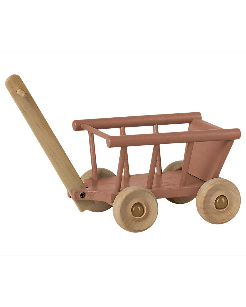 A small wagon is always needed - either to carry your best friend or the groceries. This little wagon is made in wood and painted in a soft rose color. Size : Micro Height : 5 cm Washing instruction: Surface wash Material: FSC Wood
